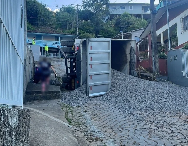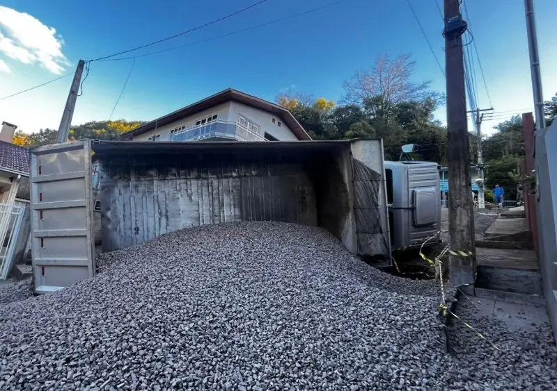 Um caminhão-caçamba carregado com britas tombou na tarde desta quinta-feira (25) enquanto subia a Rua João Dezanetti, no bairro Santa Tereza, em Joaçaba.