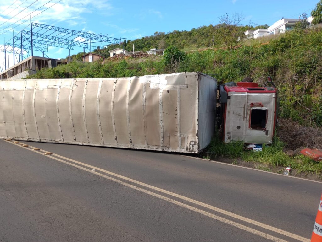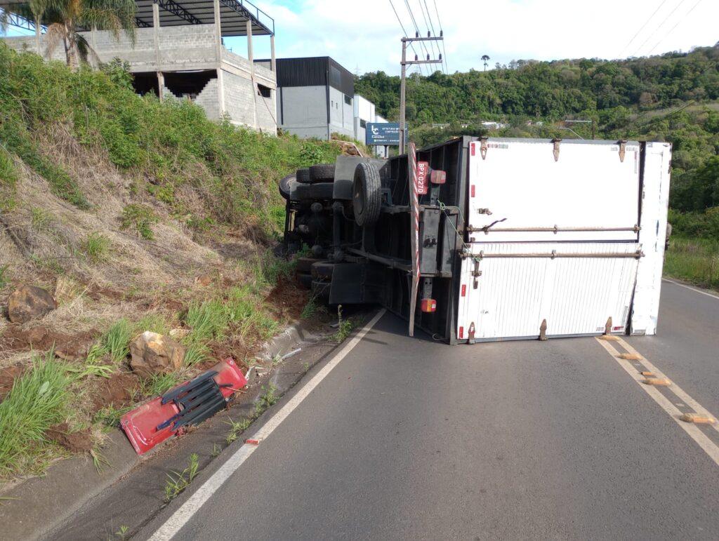 Um Ford/Cargo com placas de Cascavel-PR, tombou por volta das 06:30 da manhã desta quinta feira(09) no acesso Egídio Pozzobom em Herval d”Oeste após apresentar problemas nos freios.