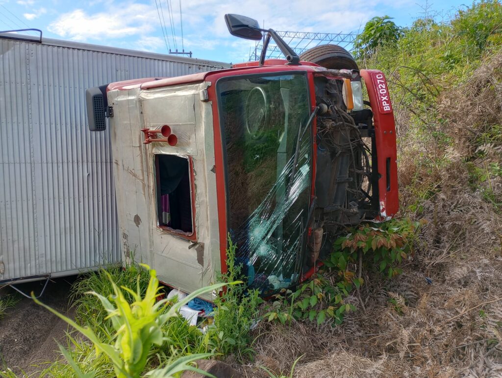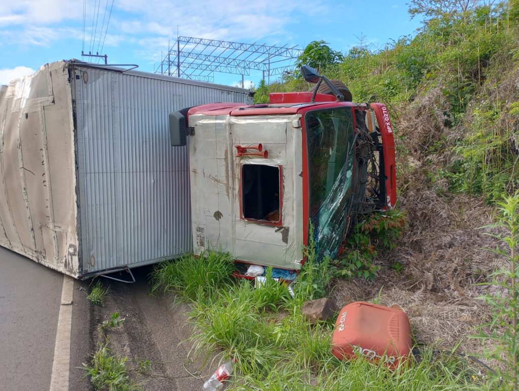 O corpo de bombeiros e o Samu atenderam a ocorrência e encaminharam o motorista ao HUST. Informações dão conta que ele sofreu apenas escoriações. A polícia militar está no local controlando o trânsito, já que o veículo ficou tombado em meia pista.