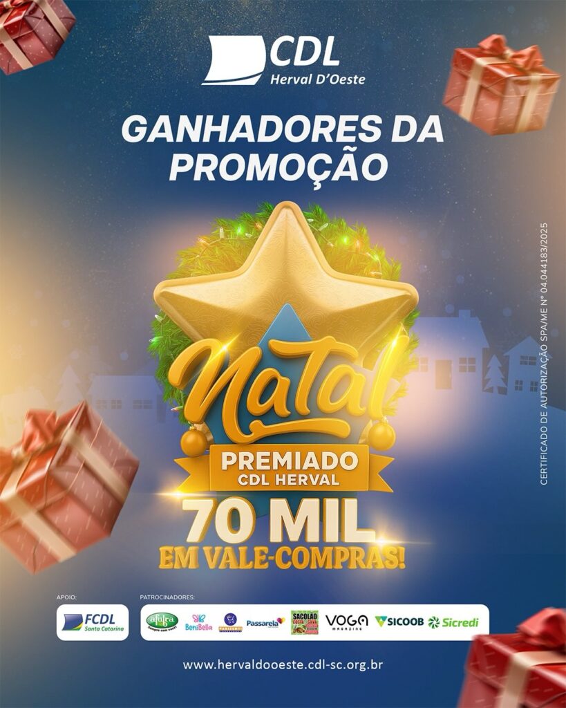 A CDL de Herval d’Oeste divulgou na manhã desta segunda-feira, 12 de Janeiro, os ganhadores da Promoção “Natal Premiado”, conforme Certificado de Autorização SPA/ME nº 04.044183/2025. Foram R$ 70.000,00 em vale-compras, que poderão ser utilizados nas empresas aderentes à promoção.