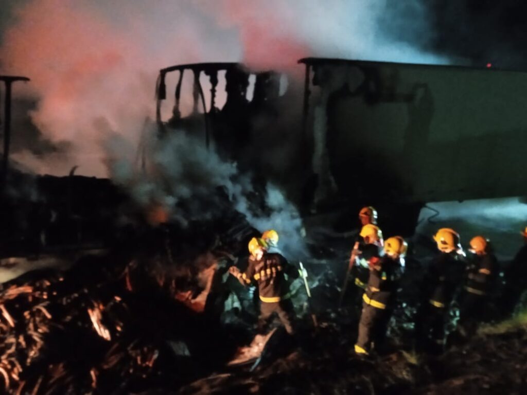 A colisão ocorreu por volta das 23h30 e envolveu um veículo de passeio com os dois ocupantes que ficaram presos às ferragens e ficaram carbonizados no incêndio. O outro veículo envolvido era uma carreta carregada de linguiça calabresa. A guarnição do Corpo de Bombeiros, que atendeu a ocorrência, não informou se o caminhoneiro ficou ferido.