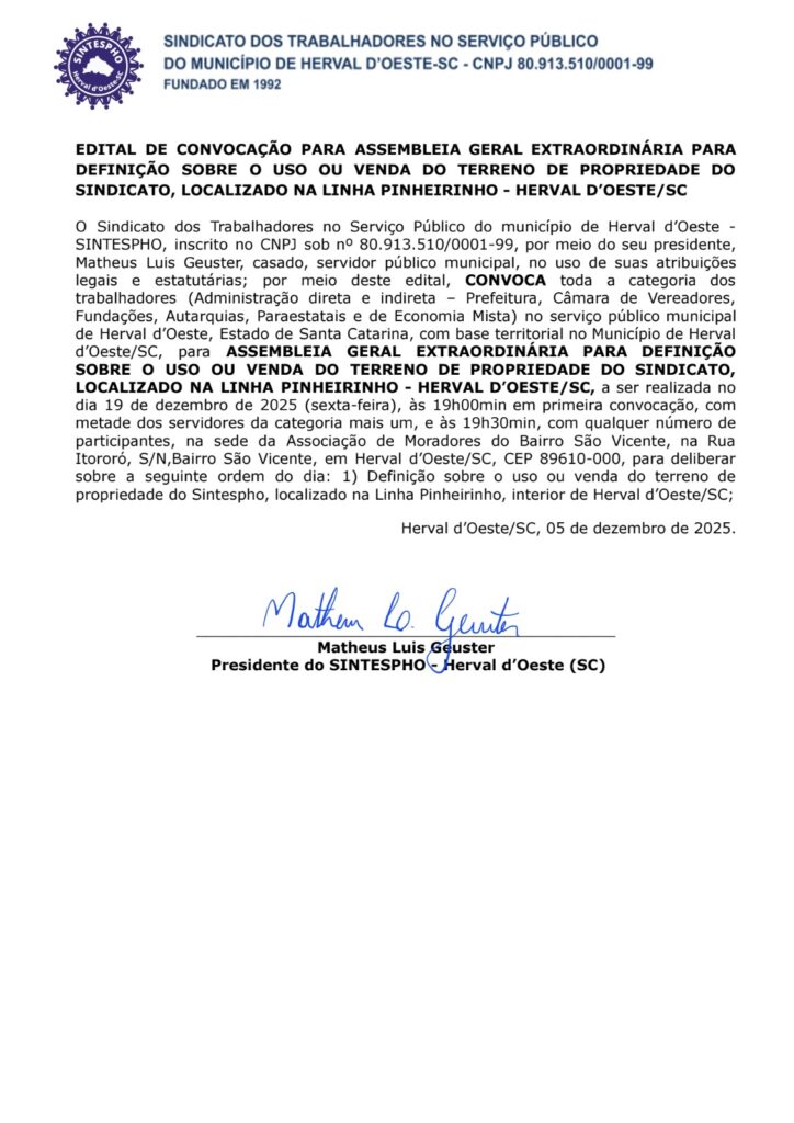 Edital de Convocação para Assembleia Extraordinária Sintespho Publicado em 05 de Dezembro de 2025. Compartilhar Facebook Twitter
