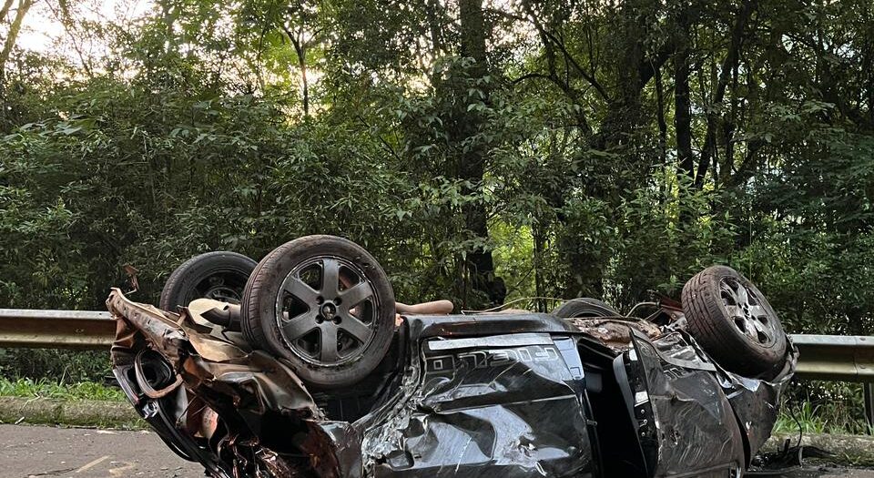 O motorista de um caminhão Scania R420 morreu após tombar o veículo na BR-153, em …