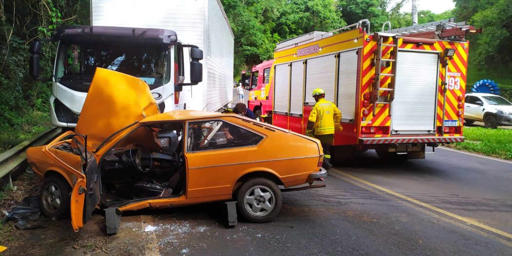 Uma colisão entre um VW/Passat e um caminhão Iveco na SC-303, próximo à pipoqueira, em …