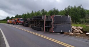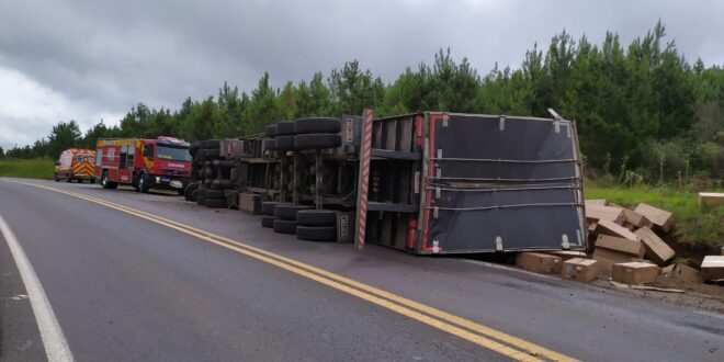 O motorista de um caminhão Scania R420 morreu após tombar o veículo na BR-153, em …
