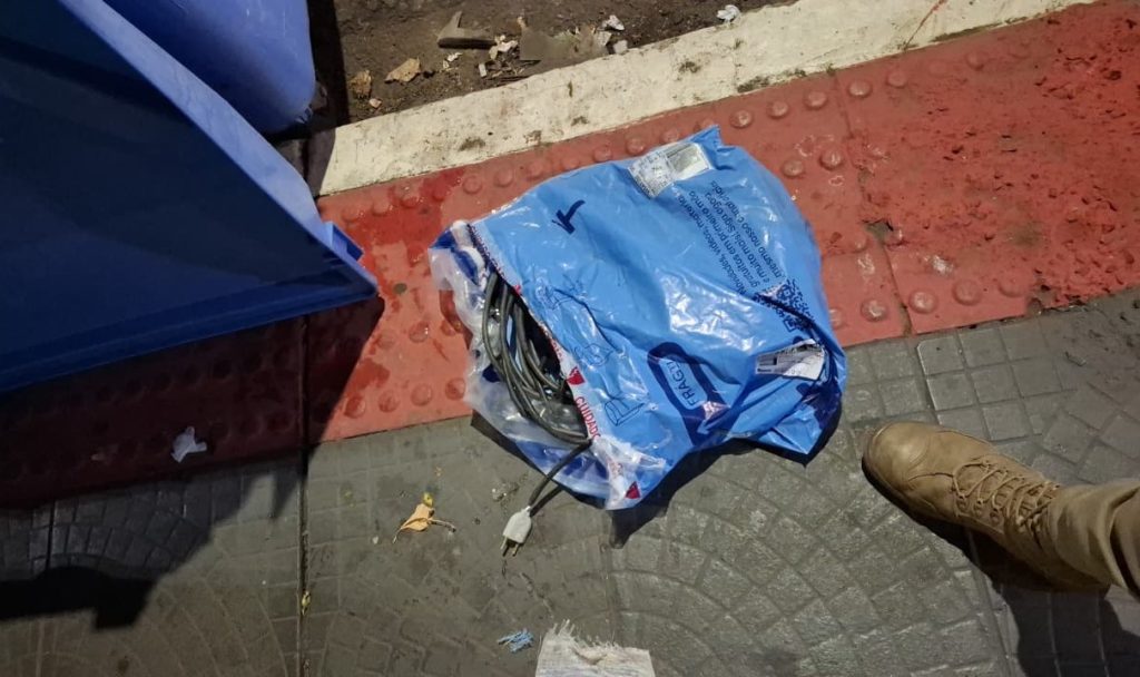 A guarnição deslocou até o local, porém o suspeito não foi localizado. Durante rondas na Rua Santos Dumont, os policiais abordaram um homem de 24 anos cujas características coincidiam com as informadas, sendo encontrado com ele um saco contendo uma extensão de fio elétrico.