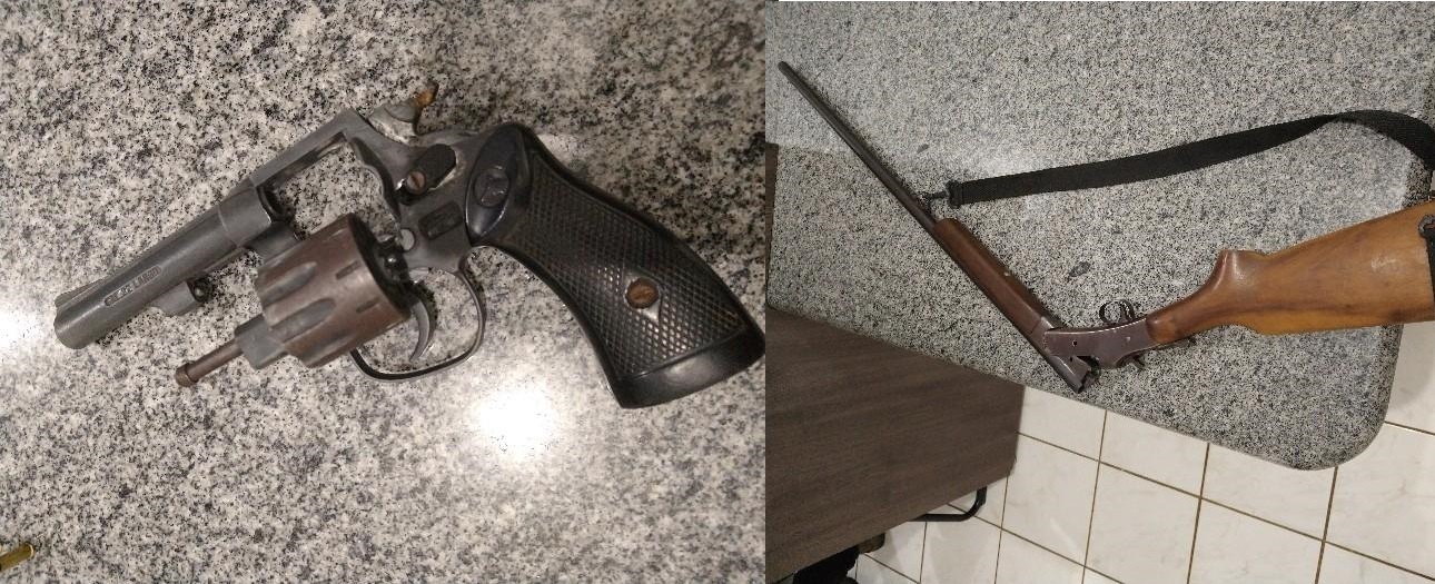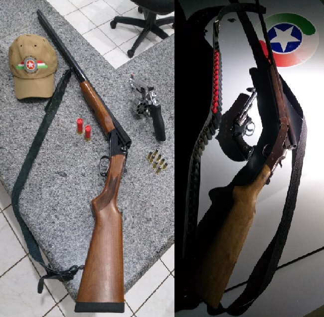 A companheira do suspeito entregou para a PM um revólver calibre 22 com uma munição intacta e sete deflagradas, bem como uma espingarda calibre 28 com 28 munições intactas e cinco deflagradas. O suspeito, um homem de 42 anos, que já se encontrava em outra casa, foi preso e conduzido à Delegacia de Polícia Civil.
