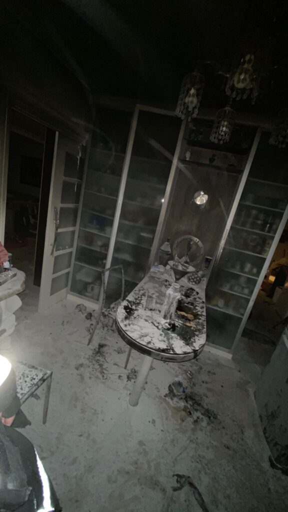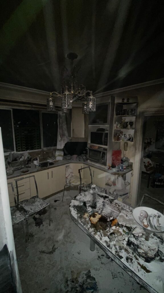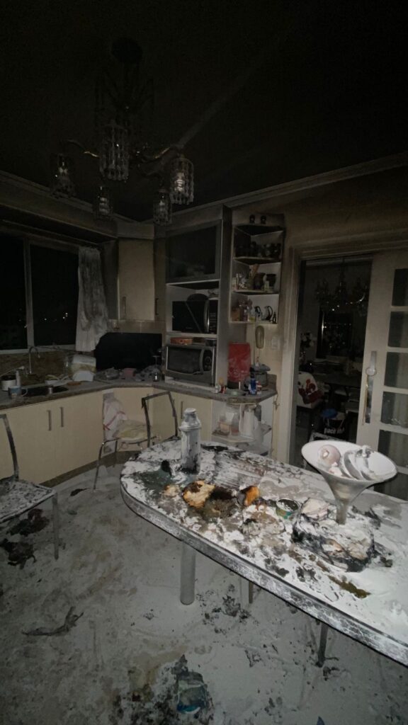 No interior da cozinha, foi constatado que uma mesa com quatro cadeiras, além de outros móveis e utensílios domésticos, foram danificados pela ação do fogo e pela temperatura elevada.
