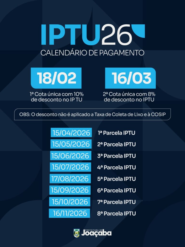 Os contribuintes do município de Joaçaba já podem imprimir o carnê do IPTU – Imposto Predial Territorial Urbano 2026. Os boletos para o pagamento estão disponíveis no site da prefeitura, na aba IPTU ONLINE https://joacaba.sc.gov.br/cartaservicos/iptu/.