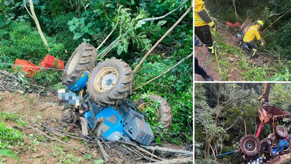 Em seguida, o trator saiu da via e capotou em um barranco, deixando a mulher presa sob a máquina.