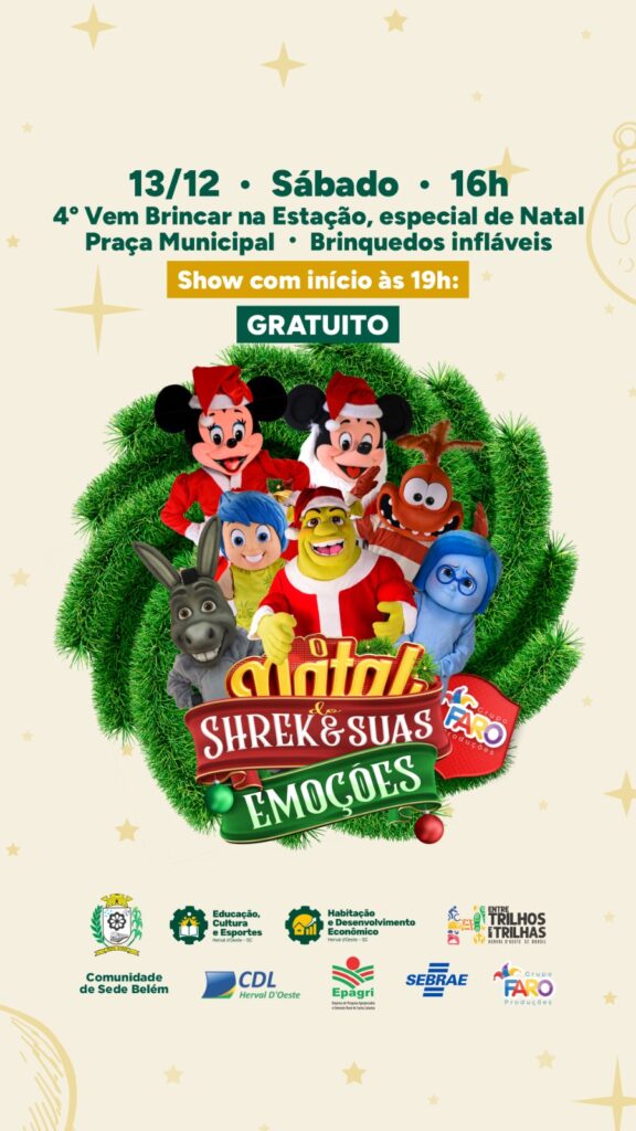 A partir das 19 horas show com Tio Ronaldo e Seus Amigos, com dezenas de personagens e o Natal Especial do Sherek.