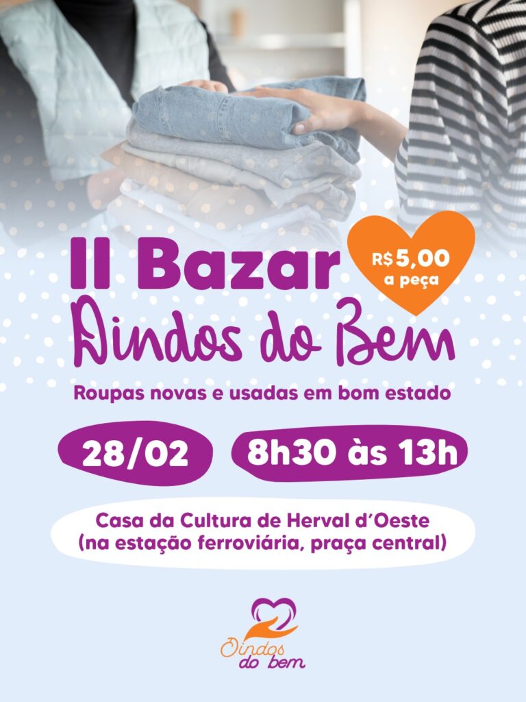 A ONG Dindos do Bem realiza nesse sábado, dia 28, das 8h às 13h, na Casa da Cultura (Estação Ferroviária, Praça Central) de Herval d’ Oeste o II Bazar de roupas e calçados novos e semi novos.