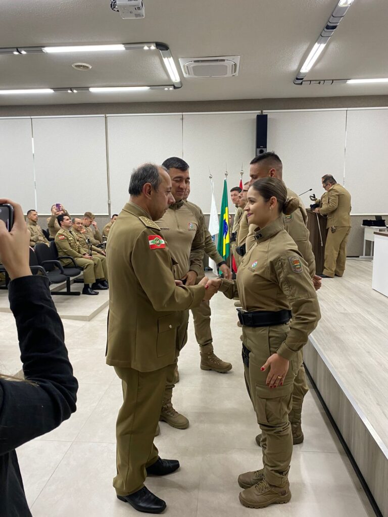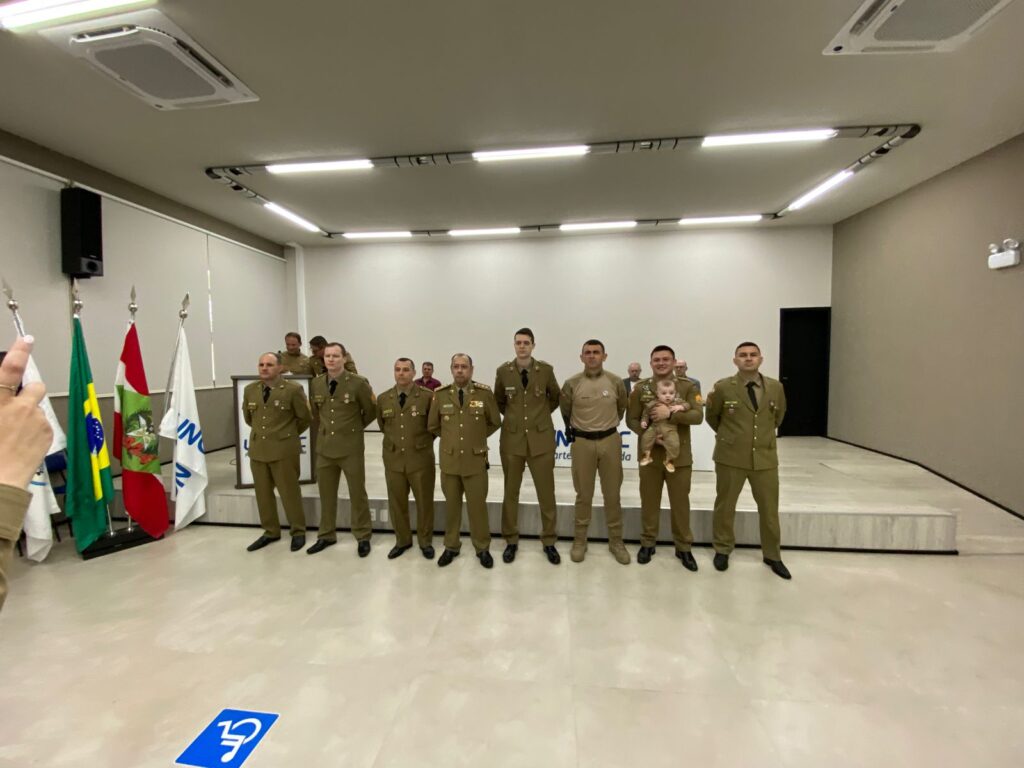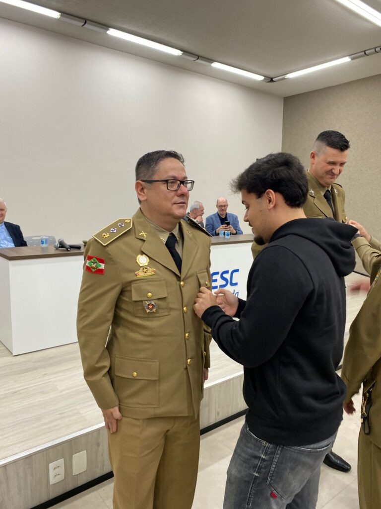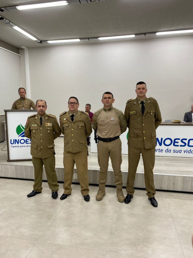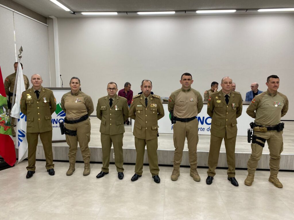 Em seu pronunciamento, o Primeiro Sargento PM José Ronaldo Branco, comandante do 26º Batalhão, exaltou a trajetória da Polícia Militar de Santa Catarina, que neste ano completa 190 anos de história. Ele destacou que a corporação “faz jus ao reconhecimento de ser a melhor do país” e valorizou o trabalho dos homenageados, reforçando o compromisso da instituição com a segurança pública e a comunidade.