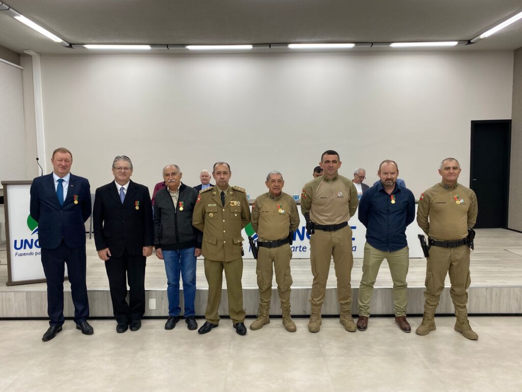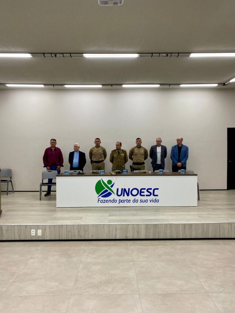 Na manhã desta sexta-feira (17), o Auditório Jurídico da Unoesc foi palco de uma solenidade especial em comemoração ao 18º aniversário do 10º Comando Regional de Polícia Militar e ao 16º aniversário do 26º Batalhão de Polícia Militar. O evento reuniu autoridades civis e militares, familiares de policiais e convidados. Entre os presentes estavam vereadores de Joaçaba, o bispo Dom Mário Marquez, o delegado da Polícia Civil Gilmar Bonamigo e familiares de oficiais.