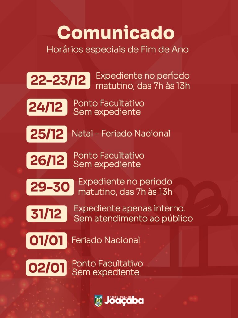 A Prefeitura de Joaçaba informa os horários especiais de funcionamento dos órgãos da Administração Municipal durante o período de fim de ano. Nos dias 22 e 23 de dezembro, o expediente ocorrerá em período matutino, das 7h às 13h. No dia 24 de dezembro, será ponto facultativo, não havendo expediente.