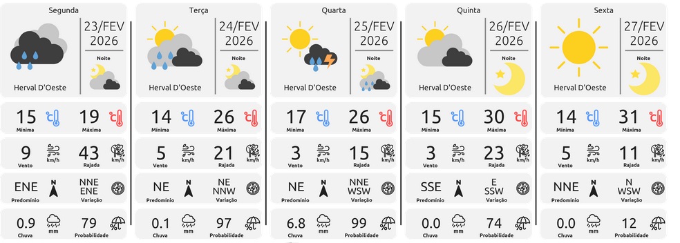 Temperatura: em elevação,máximas de 28°C a 32°C em boa parte do estado, chegando a 34°C no oeste.Vento: sul a sudeste, fraco a moderado.